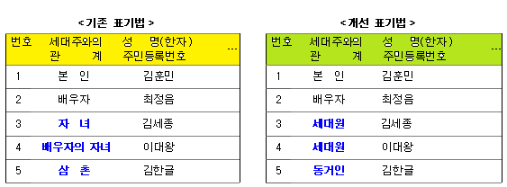 - 주민등록표 등·초본상 세대주와의 관계 및 외국인 성명 표기 방식 개선