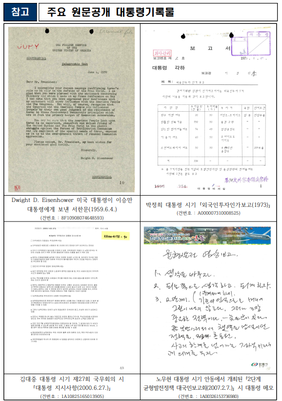 조상민 대통령기록관장 직무대리는 “이번에 추가 공개하는 대통령기록물은 약 6개월간 검토를 거쳐 공개하는 것으로, 국민과 소통하고 혁신하고자 하는 현 정부의 국정과제 지원을 위해 앞으로도 지속적으로 원문공개를 확대해 나갈 것”이라고 밝혔다.